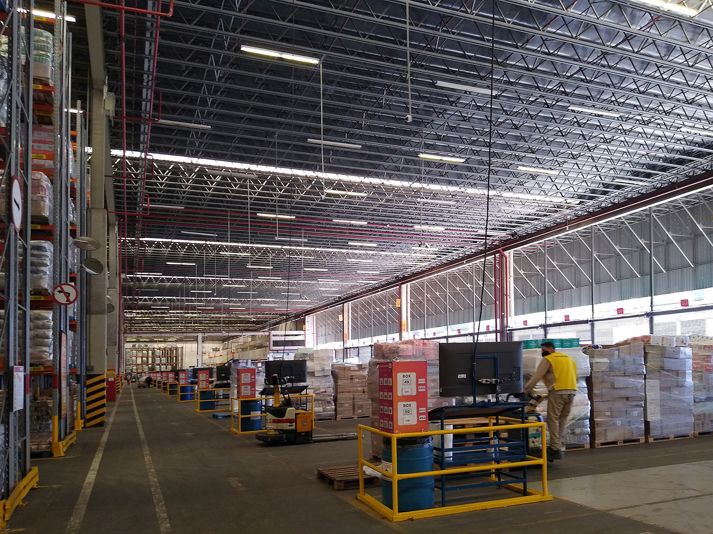Roll-on metallic coverage with thermo-acoustical insulation and natural lighting.